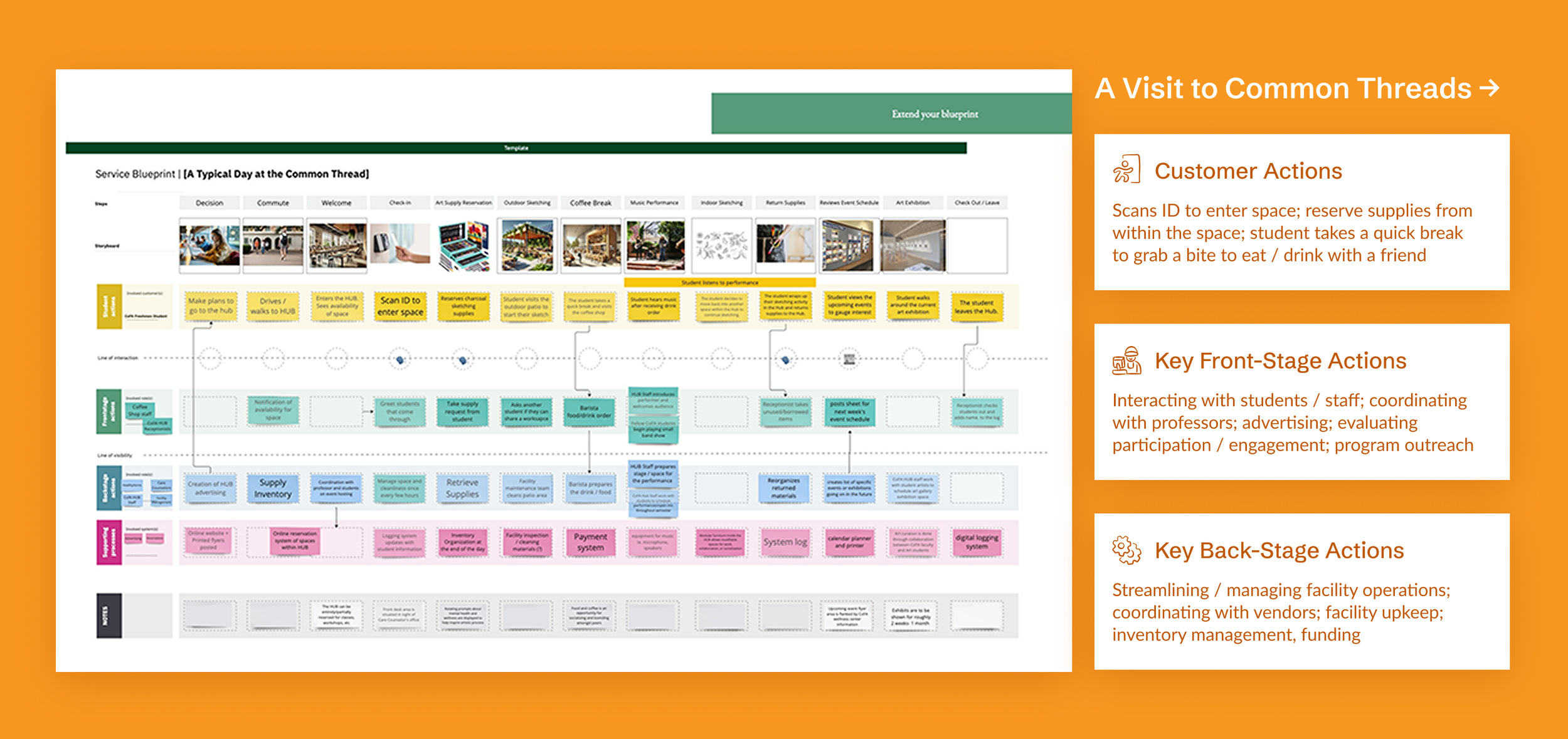 With more of our concept defined, we wanted to establish a comprehensive plan of the entire service journey for Common Threads. We created a service blueprint to visually map out the holistic experience, including visible touchpoints, backstage processes, key roles and operational considerations.