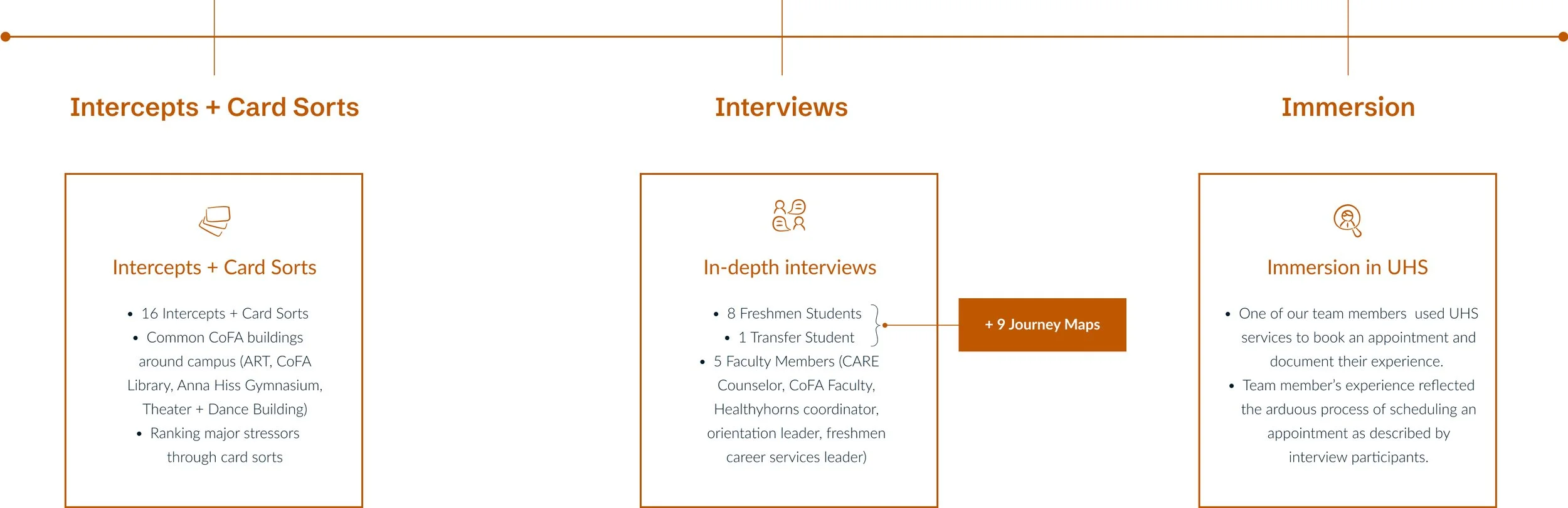 Our primary research methods included intercepts, interviews, and an immersive experience into the UHS services.