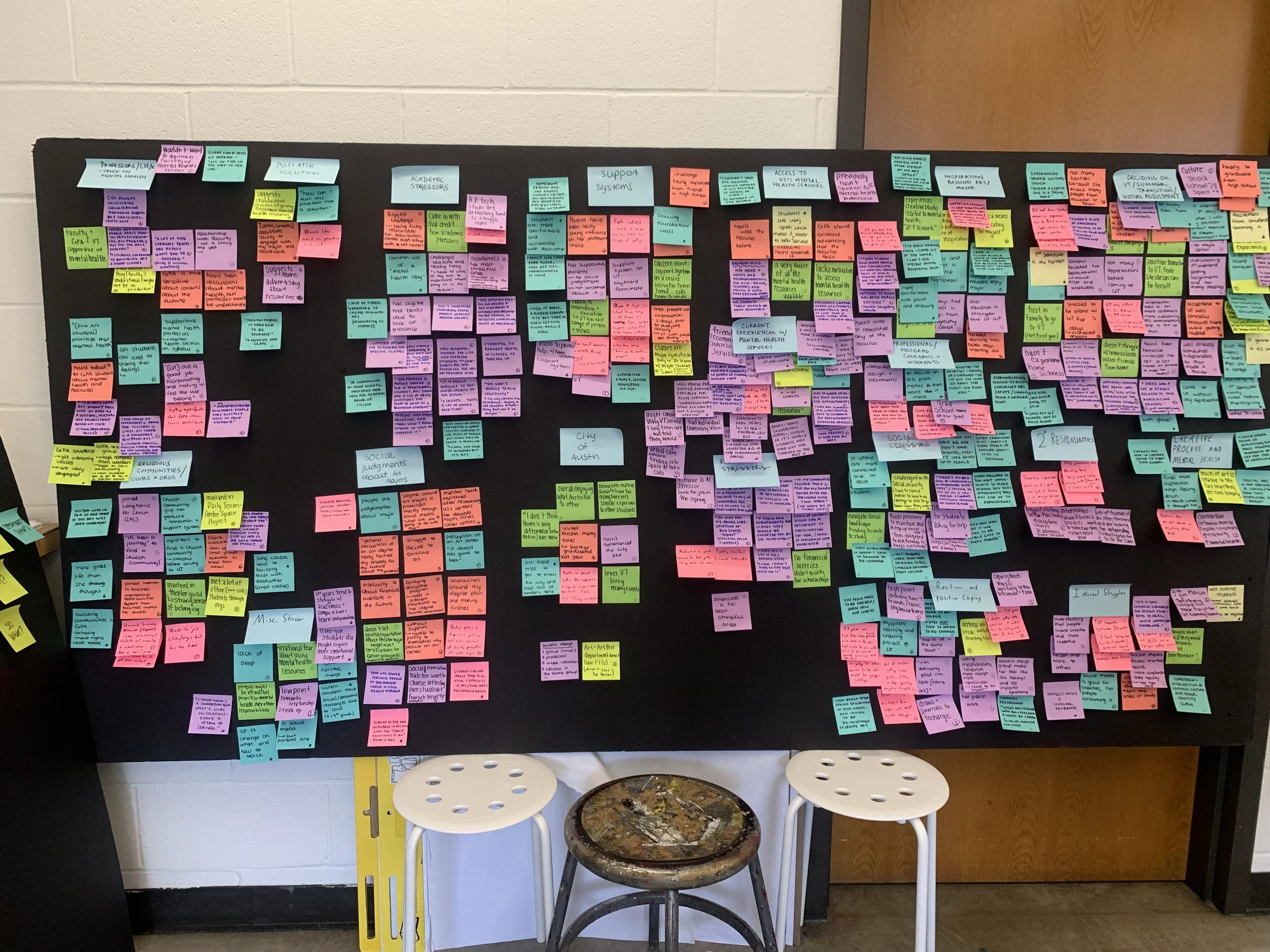 Our synthesis process and board — color-coordinated based on observations, patterns, quotes, and analyses from our research.